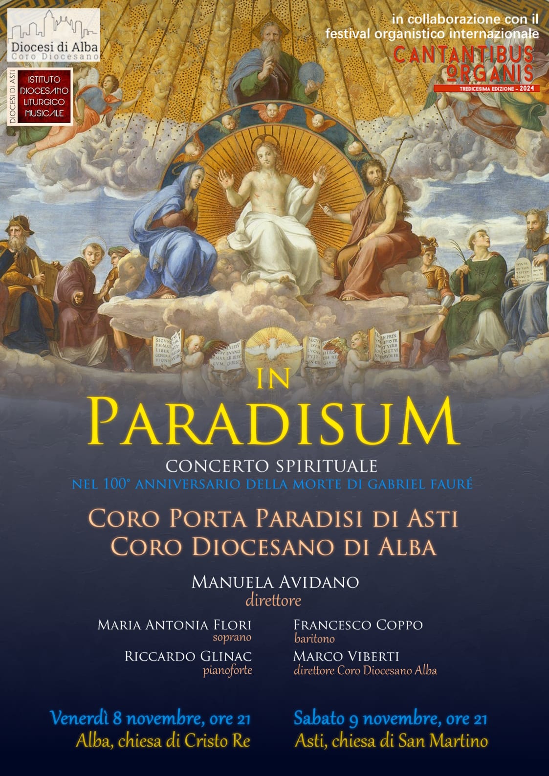La rassegna organistica internazionale “Cantantibus Organis 2024”, organizzata dall’Istituto Diocesano Liturgico-Musicale di Asti conclude gli appuntamenti con il concerto spirituale “In Paradisum”, in cui si eseguirà il Requiem di Faurè e altri brani sacri in occasione dei 100 anni dalla morte del compositore.