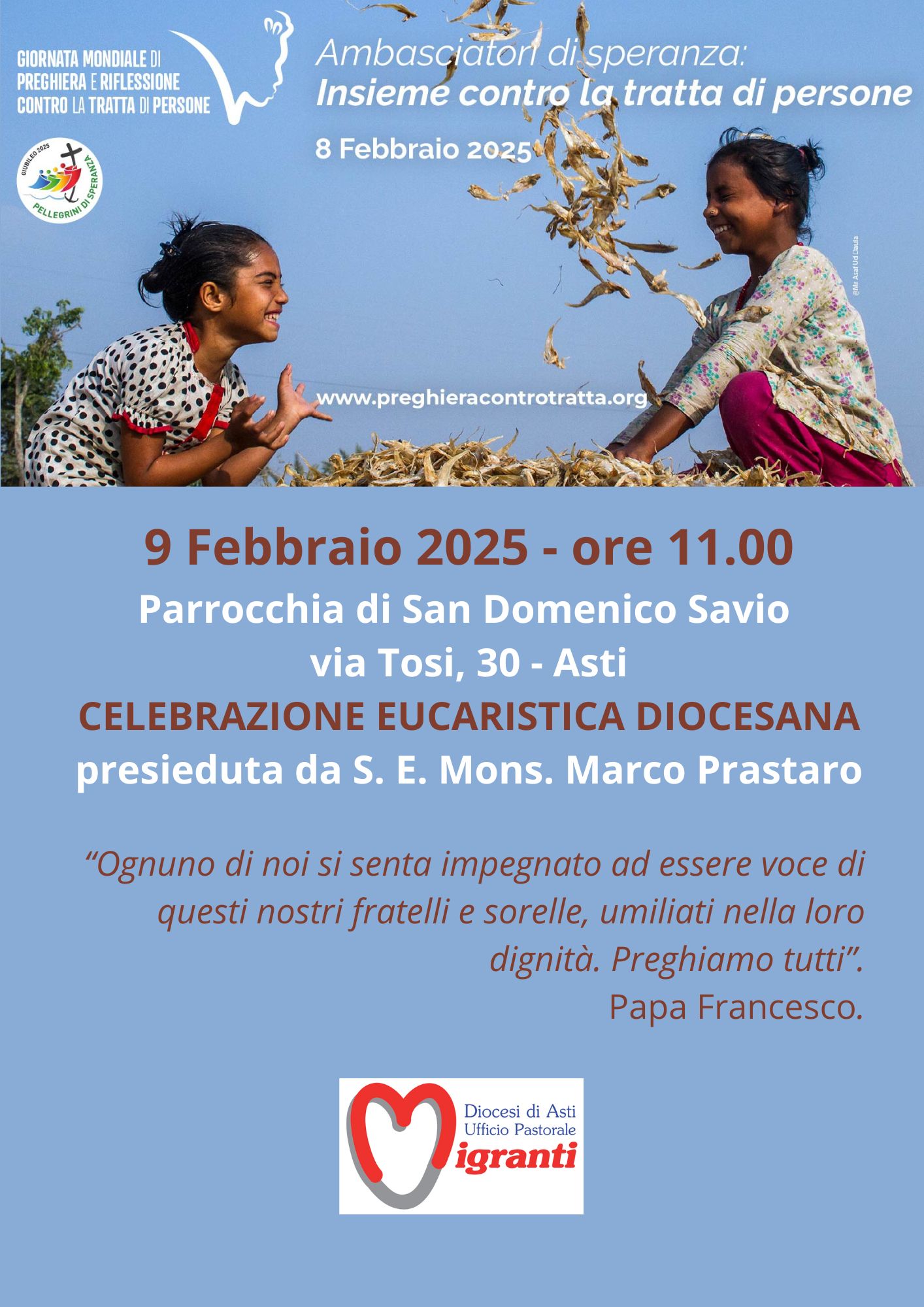 Domenica 9 febbraio, alle 11, nella parrocchia di San Domenico Savio di Asti, il vescovo Marco Prastaro presiederà la celebrazione eucaristica diocesana in occasione dell’undicesima Giornata Mondiale di Preghiera e Riflessione contro la tratta di persone il cui tema è “Ambasciatori di speranza: insieme contro la tratta di persone”.