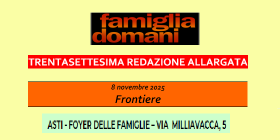 “Famiglia domani”, la rivista trimestrale edita da Gazzetta d’Asti e diretta da Anna e Luigi Ghia, organizza sabato 8 novembre, presso il Foyer delle famiglie, via Milliavacca 5, il 37° convegno annuale dal titolo “Frontiere”. Dopo una relazione introduttiva (Luigi Ghia), il professor Paolo Mirabella, teologo e docente universitario di Torino, tratterà il tema “I confini della famiglia”; don Paolo Lungo, parroco della parrocchia astigiana di N.S. di Lourdes, delineerà poi il rapporto tra famiglia e parrocchia, mentre, a seguire, la professoressa Laurana Lajolo inquadrerà storicamente il tema delle frontiere europee. Nel pomeriggio la professoressa Angela Dessimone, della redazione di Famiglia domani e già dirigente scolastico, affronterà il tema delle frontiere nella società; il professor Guido Ghia (Istituto Europa Unita di Chivasso e Università di Genova) terrà una relazione sul tema “Frontiere dell’etica, frontiere dell’umano”, seguita dalla relazione del professor Francesco Ghia (Università di Trento) che relazionerà su “Le frontiere della teologia”. Il convegno verrà concluso dalla relazione del professor Stefano Zerbini, animatore spirituale AGESCI di Mirandola, Modena, e redattore di Famiglia domani, sul tema; “Le frontiere del cristianesimo”. Una giornata intera di lavoro, in amicizia, intervallata da una pausa pranzo all’interno della struttura ospitante. L’accoglienza dei partecipanti inizierà alle ore 8:45 con un caffè di benvenuto. I lavori avranno inizio alle ore 9:30 per concludersi non oltre le ore 17:30.