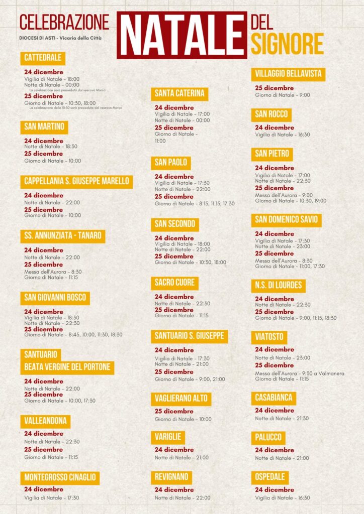 Pubblichiamo gli orari completi delle messe di Natale (vigilia, notte, aurora e giorno) delle parrocchie della vicaria urbana; una fotografia di opportunità che documenta lo sforzo per garantire celebrazioni sia nella vigilia, sia nel giorno stesso di Natale in modo diffuso e così far vivere a tutti il momento “bello” della festa.