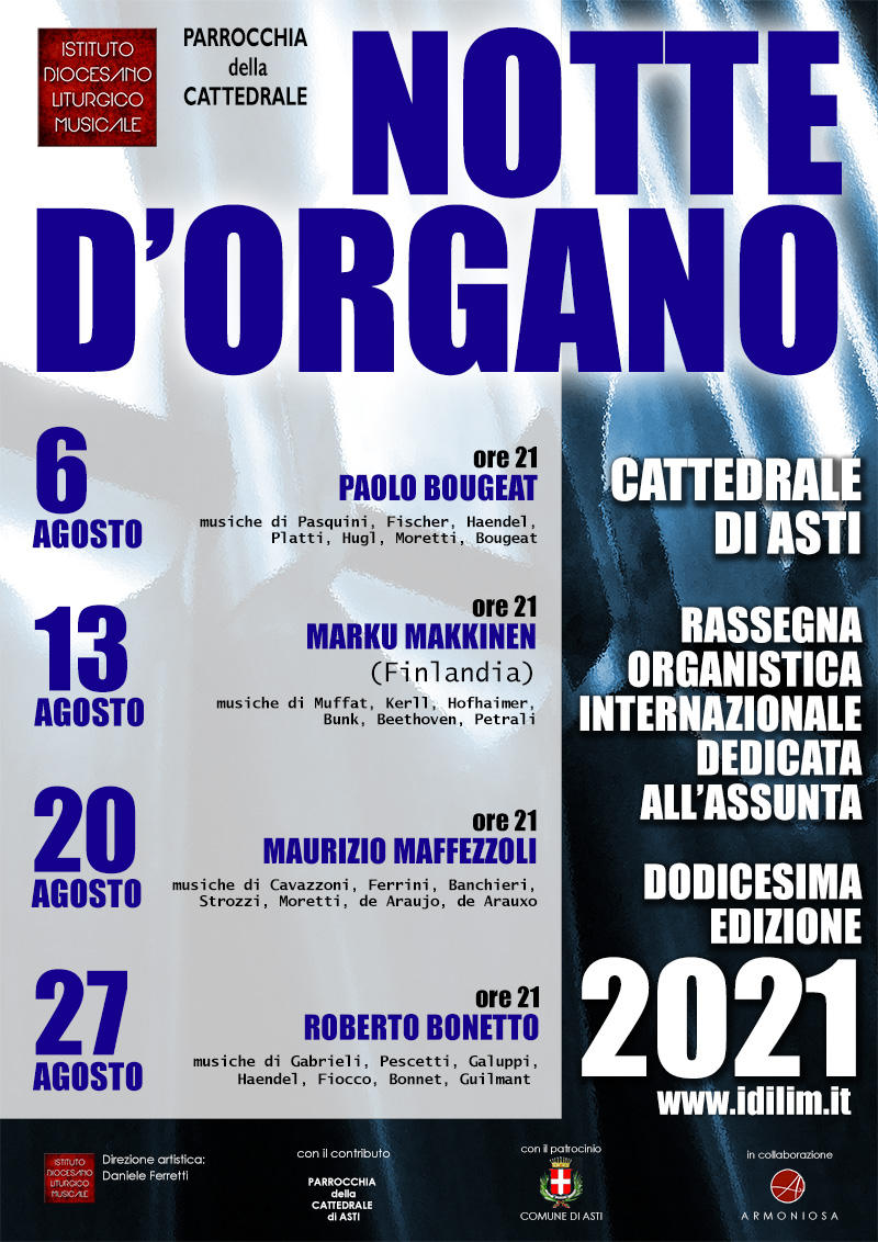 Anche quest’anno torna NOTTE D’ORGANO, il festival organistico internazionale della Cattedrale di Asti, organizzato dall’Istituto Diocesano Liturgico Musicale per l’undicesimo anno consecutivo. Nata da un’idea del parroco don Paolo Carrer, la rassegna intende valorizzare gli organi storici del Duomo, creare una sorta di cornice alla solennità liturgica dell’Assunzione della Beata Vergine Maria, e offrire un’occasione per una visita serale della splendida chiesa. Tutti i concerti si terranno il venerdì e inizieranno alle ore 21. Nello svolgimento dei concerti saranno adottate tutte le misure previste dalle normative finalizzate al contenimento della diffusone del COVID-19: sarà richiesto, pertanto, il corretto utilizzo delle mascherine e il rispetto delle distanze interpersonali. La rassegna gode del patrocinio del Comune di Asti e la direzione artistica è di Daniele Ferretti. Quest’anno gli artisti ospitati si esibiranno con il seguente calendario: