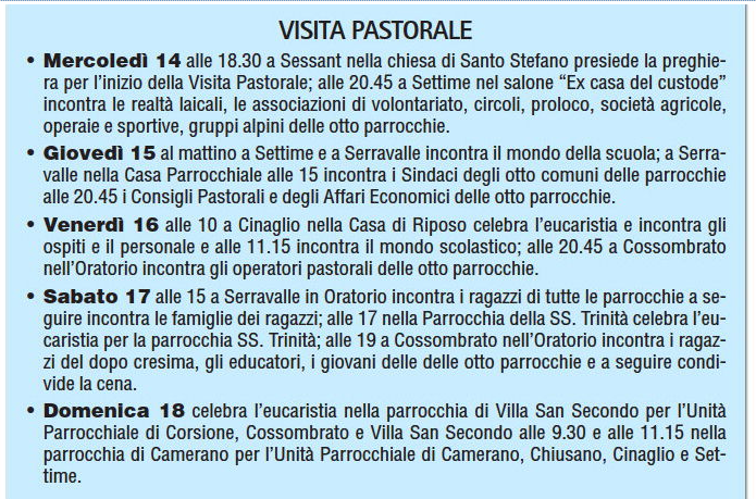 “Ritengo – scrive Mons. Vescovo – che la visita pastorale possa essere per tutti un momento forte di esperienza di Chiesa e di fraternità, per le singole comunità potrà essere un’occasione preziosa per fare una verifica del cammino percorso, per tutti sarà un momento importante nel quale, con serenità e calma, potremmo meglio delineare il cammino futuro delle nostre parrocchie”.