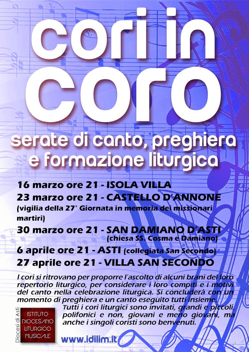 12 Marzo 2019 amartinetto Serata di canto,preghiera e formazione liturgica “Cori in Coro” presso la Chiesa di San Pietro di Isola Villa sabato 16 Marzo Descrizione: 1 Inizio: 16/03/2019 21:00 Fine: 16/03/2019 21:00 Categorie: Agenda pastorale Allegati: serate canore