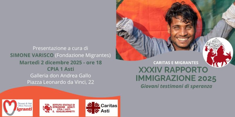 Martedì 2 dicembre 2025 alle ore 18, presso la Galleria don Andrea Gallo del CPIA 1 di Asti (piazza Leonardo da Vinci 22), l’Ufficio diocesano Pastorale Migranti, insieme a Caritas Asti e al CPIA, presenta il XXXIV Rapporto Immigrazione 2025 di Caritas Italiana e Fondazione Migrantes. All’incontro interverrà Simone Varisco, storico, saggista e curatore del volume per la Fondazione Migrantes.